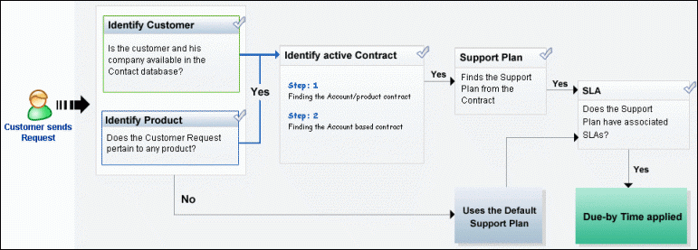 Users raise requests into SupportCenter Plus and these requests are resolved based on contracts, provided the user has an account in the SupportCenter Plus database. If the user has an valid account, then the contract associated to the account is identified after which, the due by time for the request is applied.