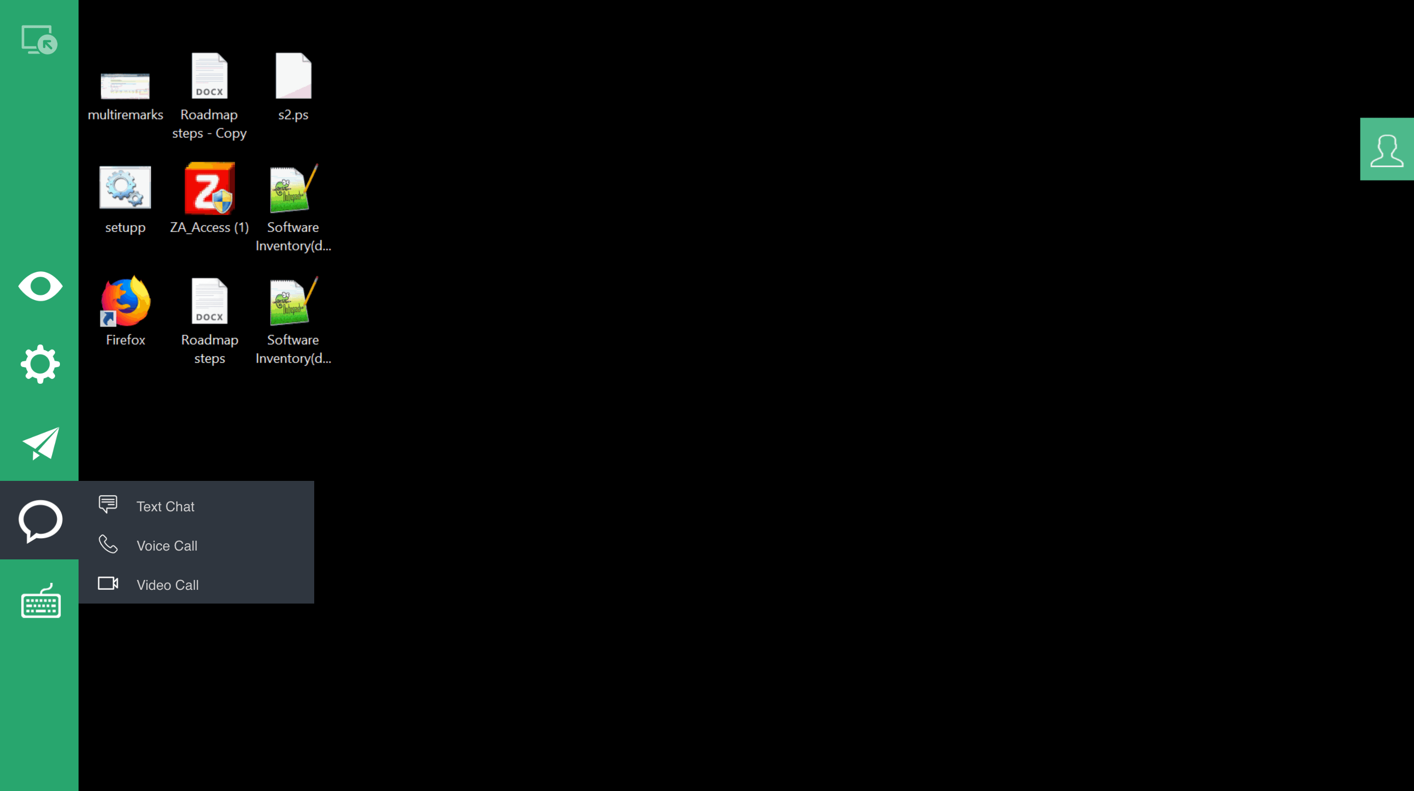While troubleshooting computers remotely, one major concern is understanding what exactly is preventing the end user from getting their work done. Often, the best way to get to the root of the problem is to start chatting with the end user about their issue. Remote Access Plus offers voice, video and text types of remote chat options to get you started. You can initiate any of these three chats from homescreen and also from the remote control screen.