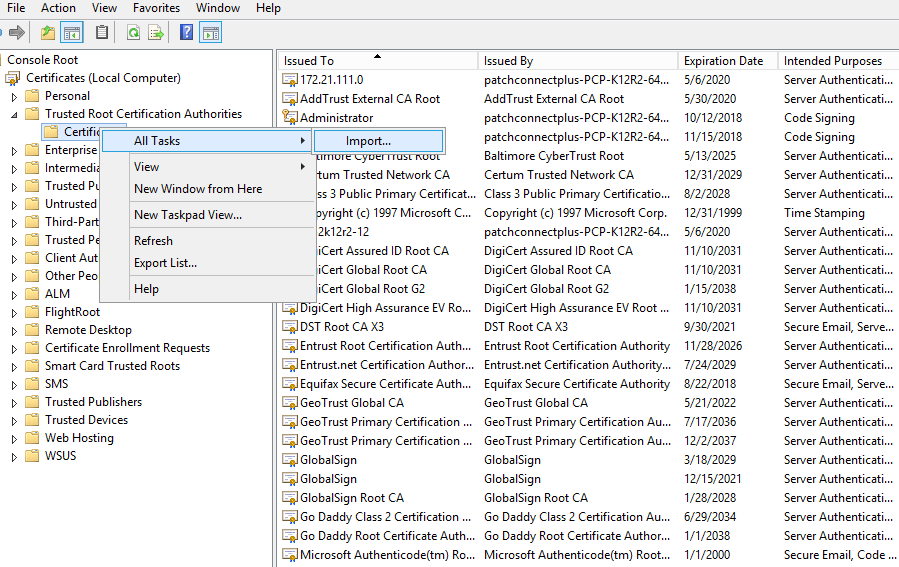 - Right click 'Trusted Root Certification Authorities' > All tasks > Import