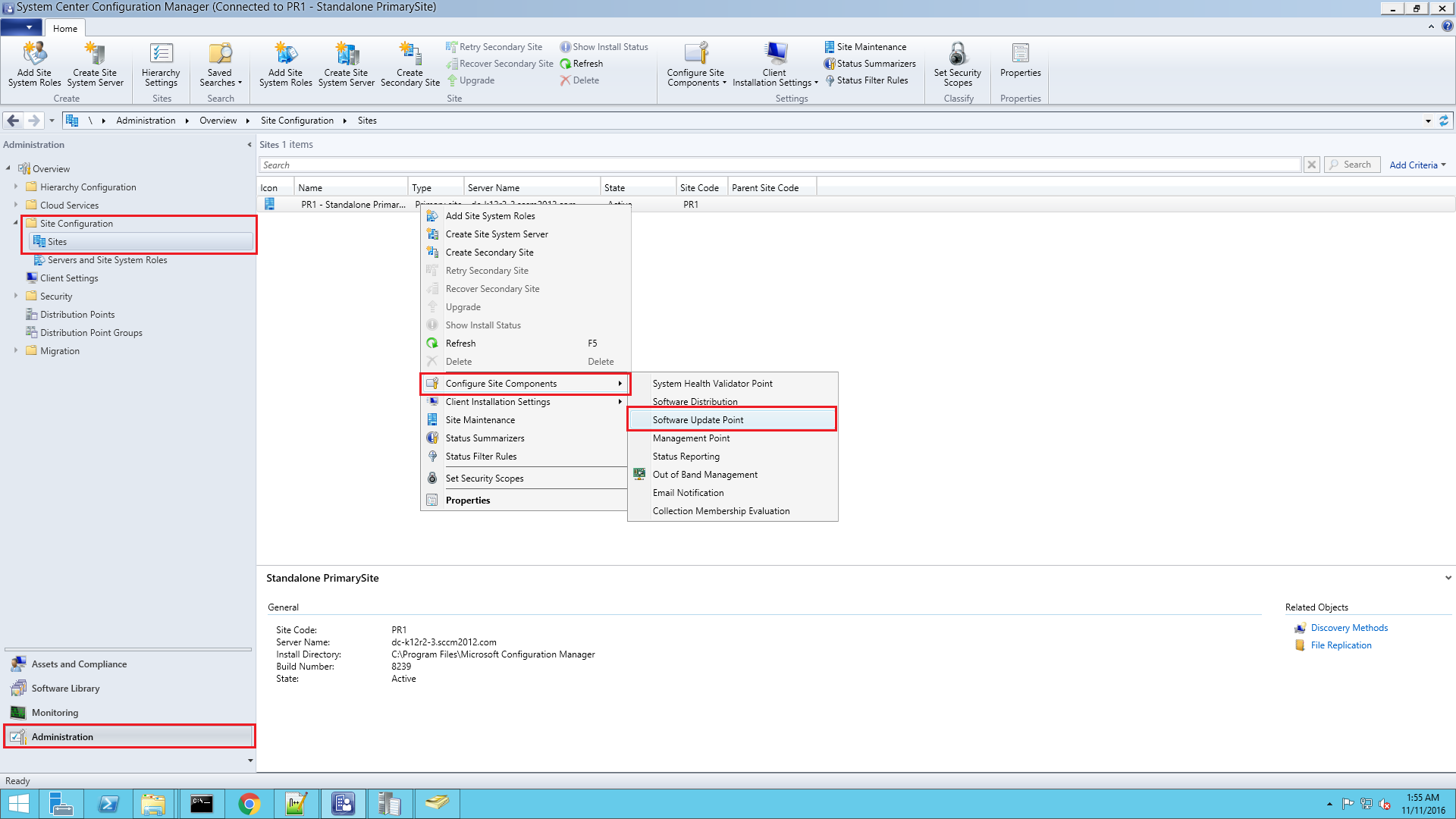 - Right click on your primary site > Configure Site Components > Software Update Point