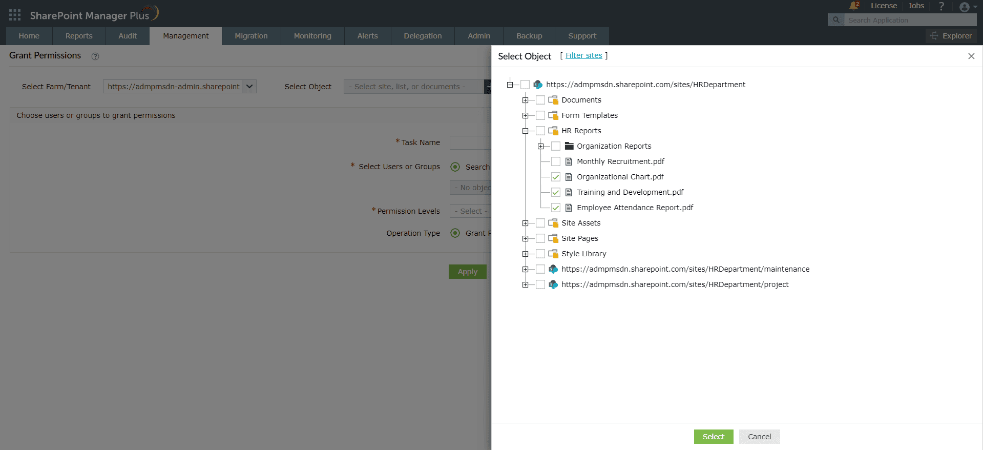 Granting user and group permissions in SharePoint Manager Plus