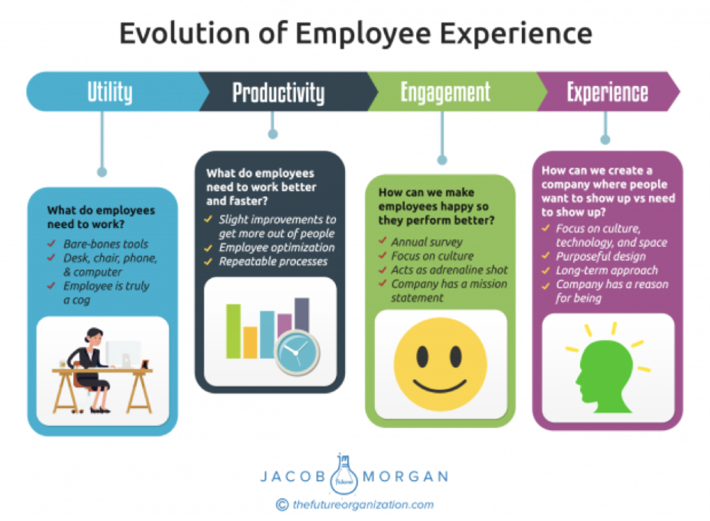 As Jacob Morgan, author of the book The Employee Experience Advantage, describes it, the experience organizations have delivered to their employees is evolving through four stages:
