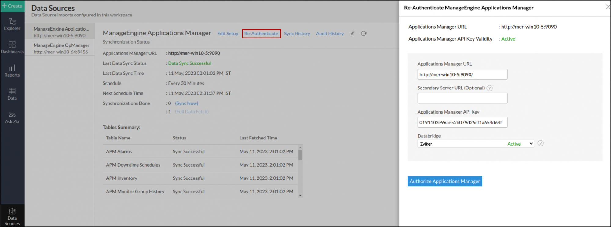 The synchronization of your Applications Manager data can sometimes fail, due to a variety of reasons. To resolve this, click the Data Sources option from the side panel and click the Re-Authenticate link. In the popup that appears, click Authorize Applications Manager. Verify the Applications Manager URL, enter the regenerated API key, select the required ManageEngine Databridge from the Databridge drop-down, and click the Authorize Applications Manager button.