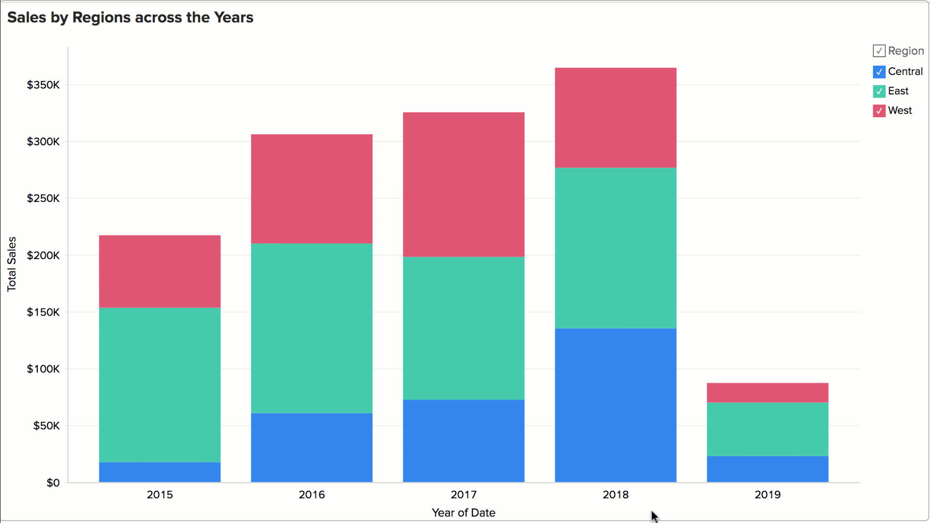 If Legend Filters are exposed then users of the chart can dynamically filter the data series in a chart by selecting/deselecting the corresponding legend item connected to the data series. For instance, in a chart that displays date wise sales in each region, if you want to display only East and West region data, hover the mouse on the legend and deselect the Central legend item. This removes the Central region data and will dynamically regenerate the chart with the remaining data as shown below.