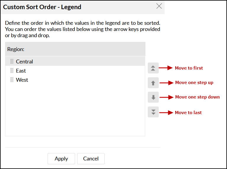 Note: The Custom Sort Order dialog box will list all values in the column. The filter criteria applied on the chart will not be applied here.In case the value is no longer available in the underlying data, you will find an option to delete it from the Charts custom sort dialog.