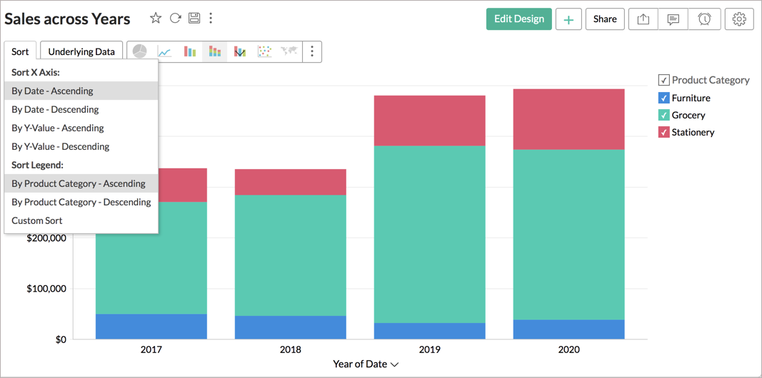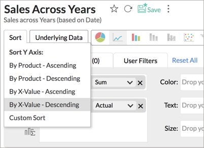 Note: You can sort charts only when either a Category OR a Date column is a available on the X or the Y axis.