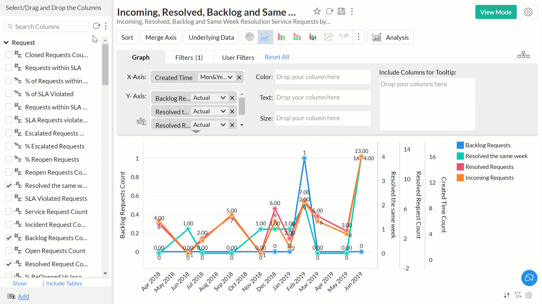 In ManageEngine Analytics Plus, when you create a Line, Scatter, Bar and Combination chart with multiple Y-axes, by default each Y-column will be plotted in its own axis i.e., with split (separate) axis. However, you can choose to combine or merge them per your requirements.