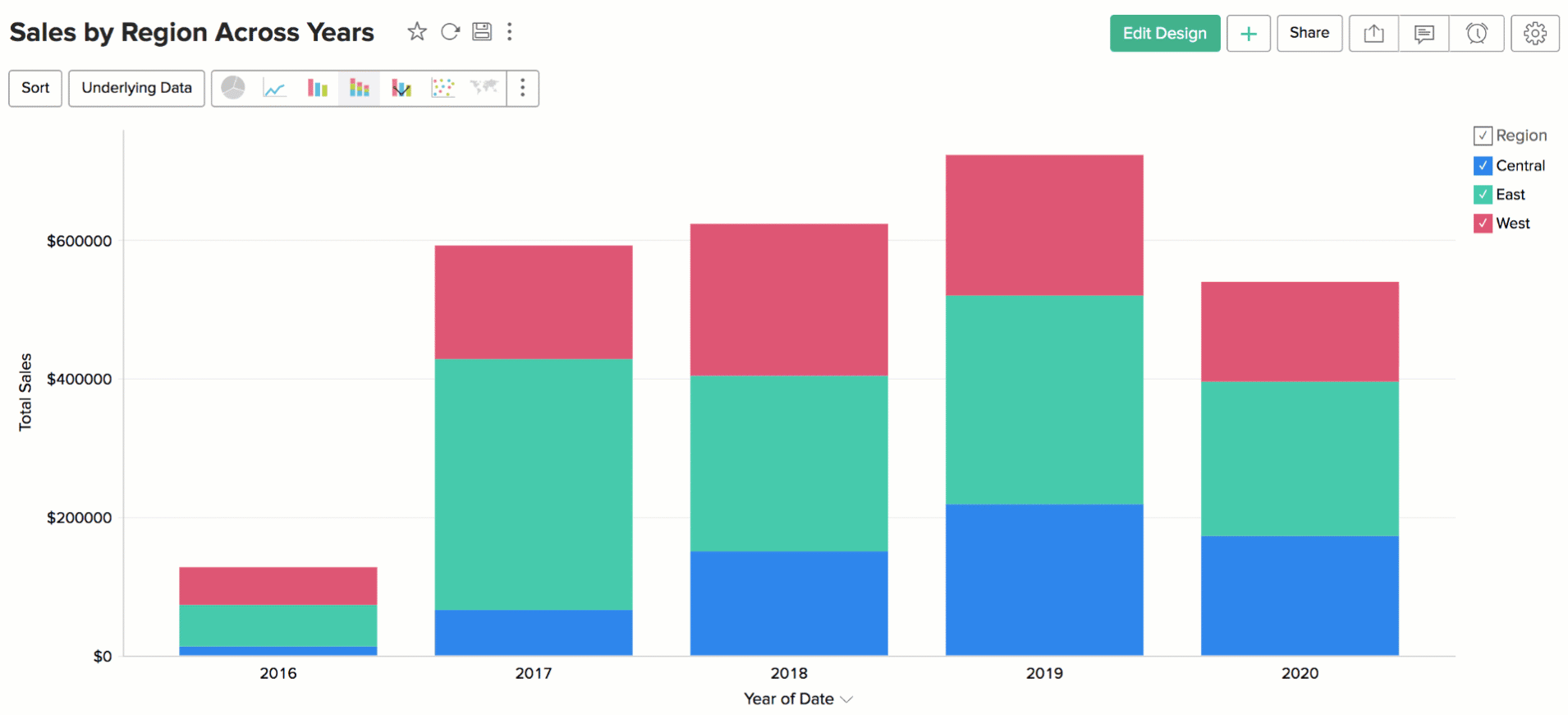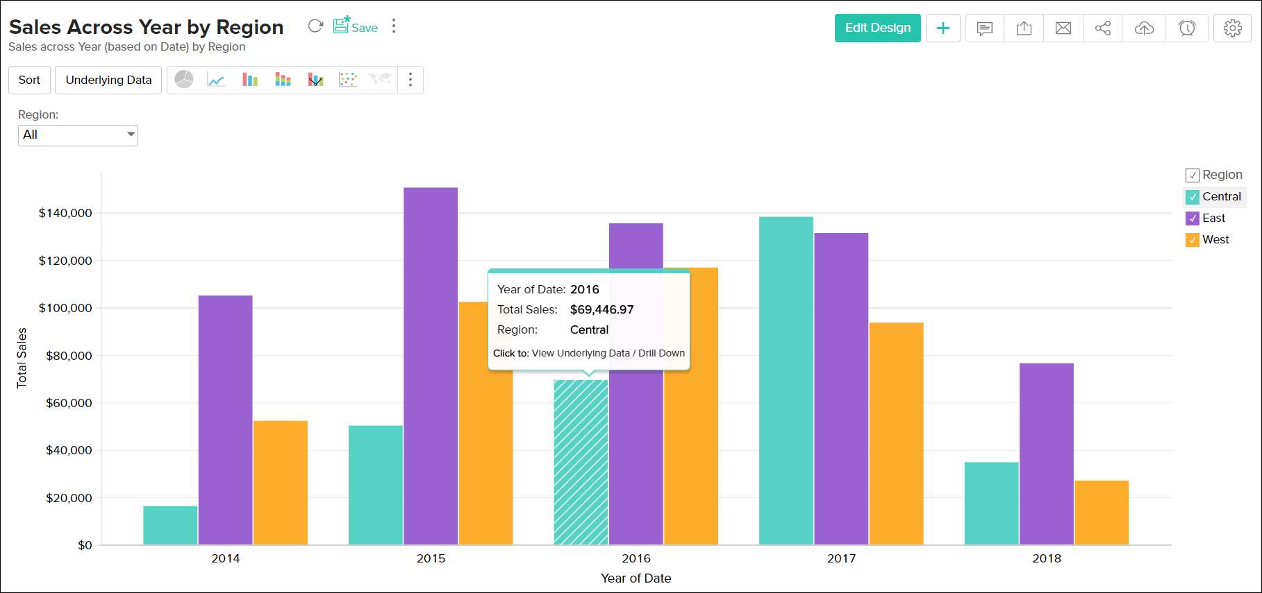 The following screenshot shows the underlying sales data from Region "East" in the year "2014" displayed, when you click on the corresponding bar on the chart.