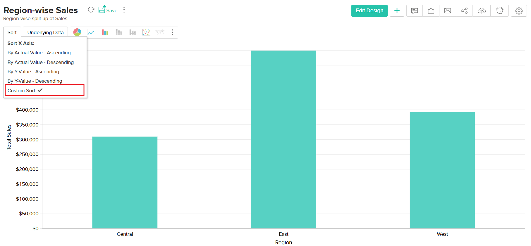 You can also sort your chart based on the chart legend values in either the ascending or the descending order, or apply a custom sort.