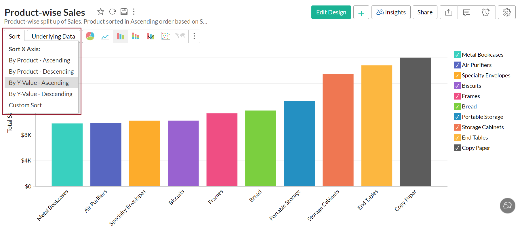 By Y-value - Ascending: Sorts the chart in ascending order based on the Y-axis values.