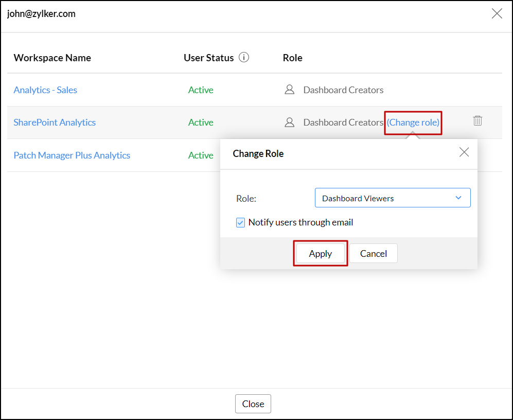 Analytics Plus enables you to assign different custom roles for each shared workspace. So a user can hold multiple custom roles. Follow the steps below to do this.