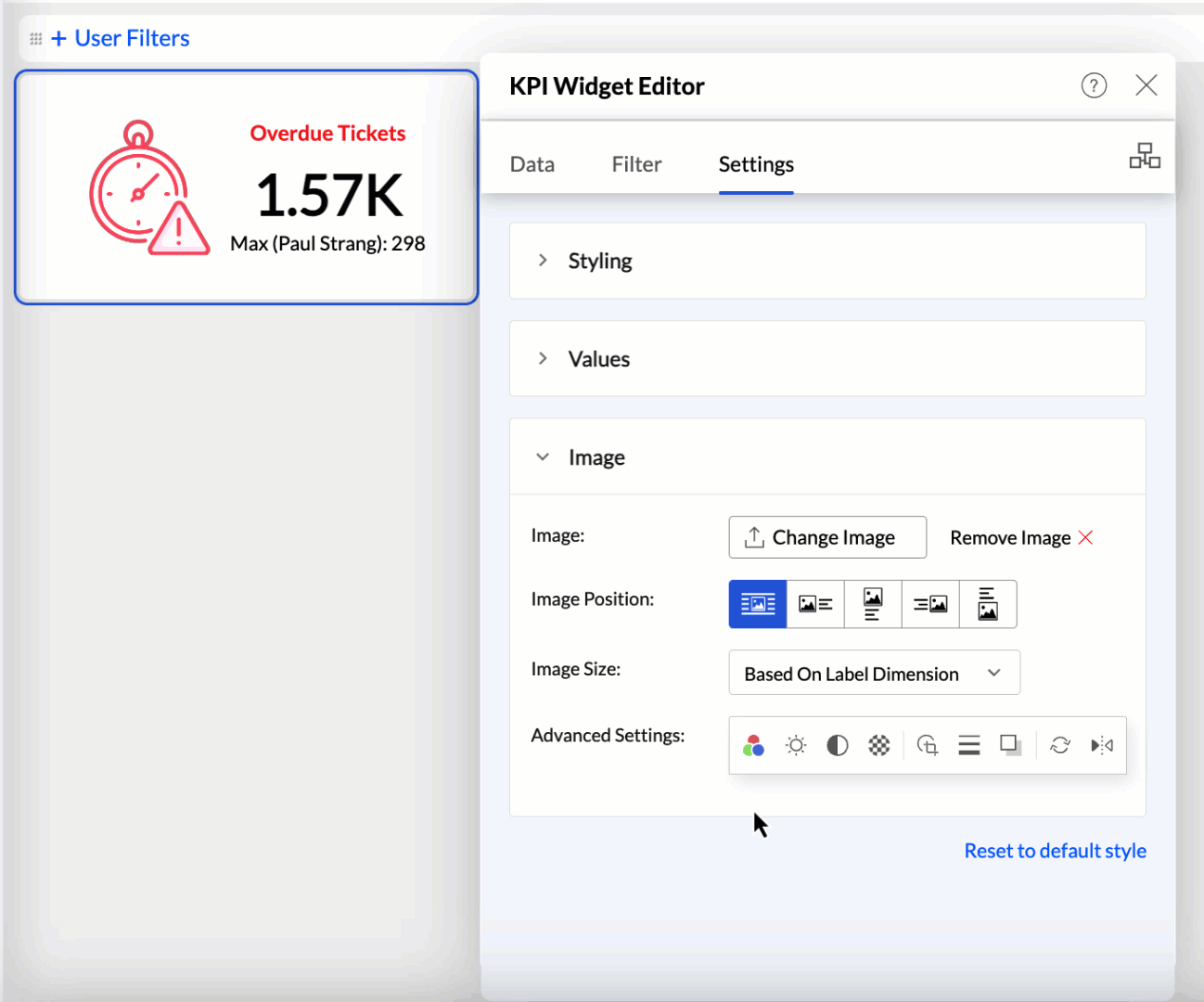To revert any changes made to the image or icon, click the Reset to default style link at the bottom of the image editor.