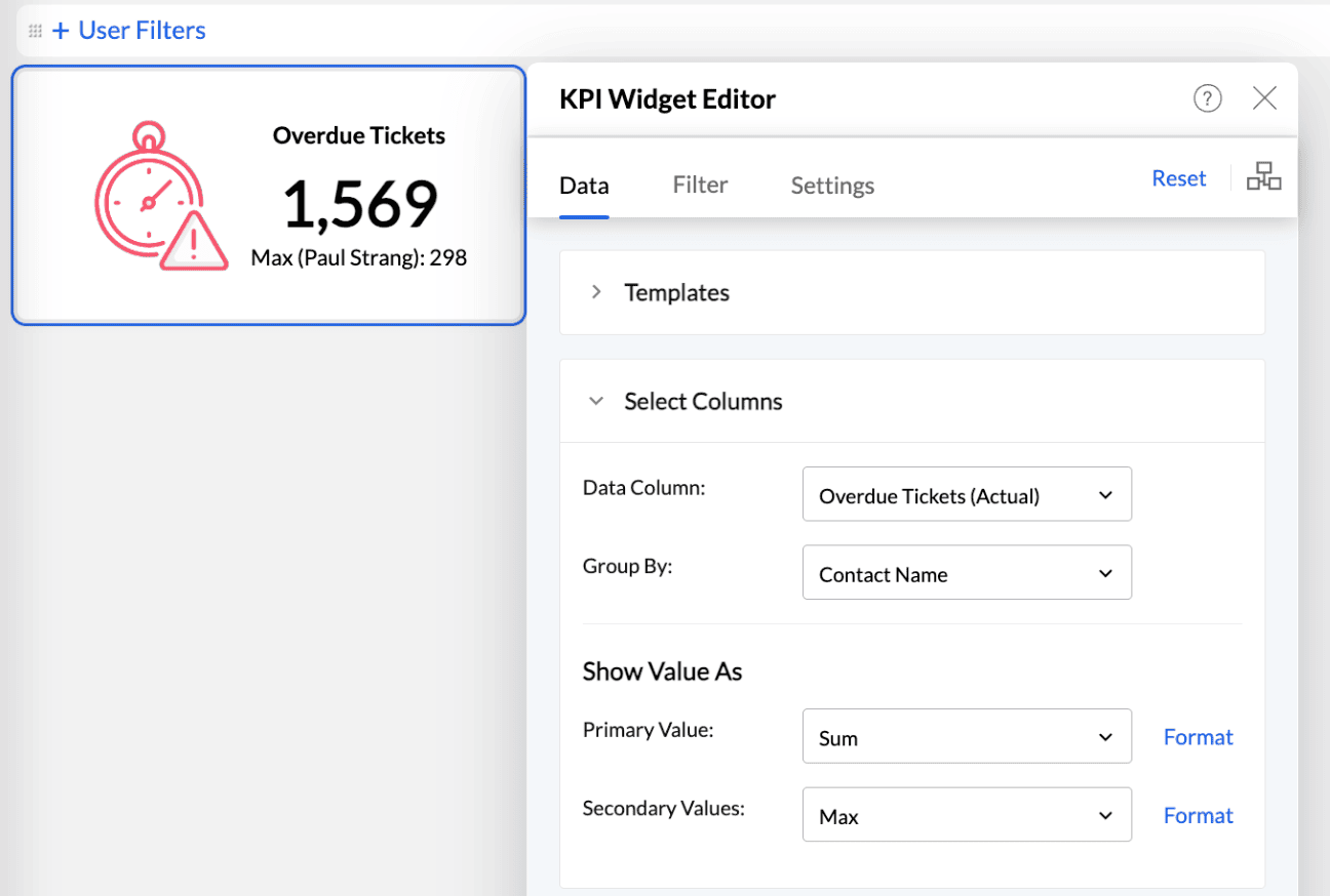 For instance, if your primary metric is total sales, you can also choose to display the maximum and minimum sales values along with the main value by selecting the appropriate template. A maximum of two secondary values can be displayed with the primary value, based on the selected widget template.