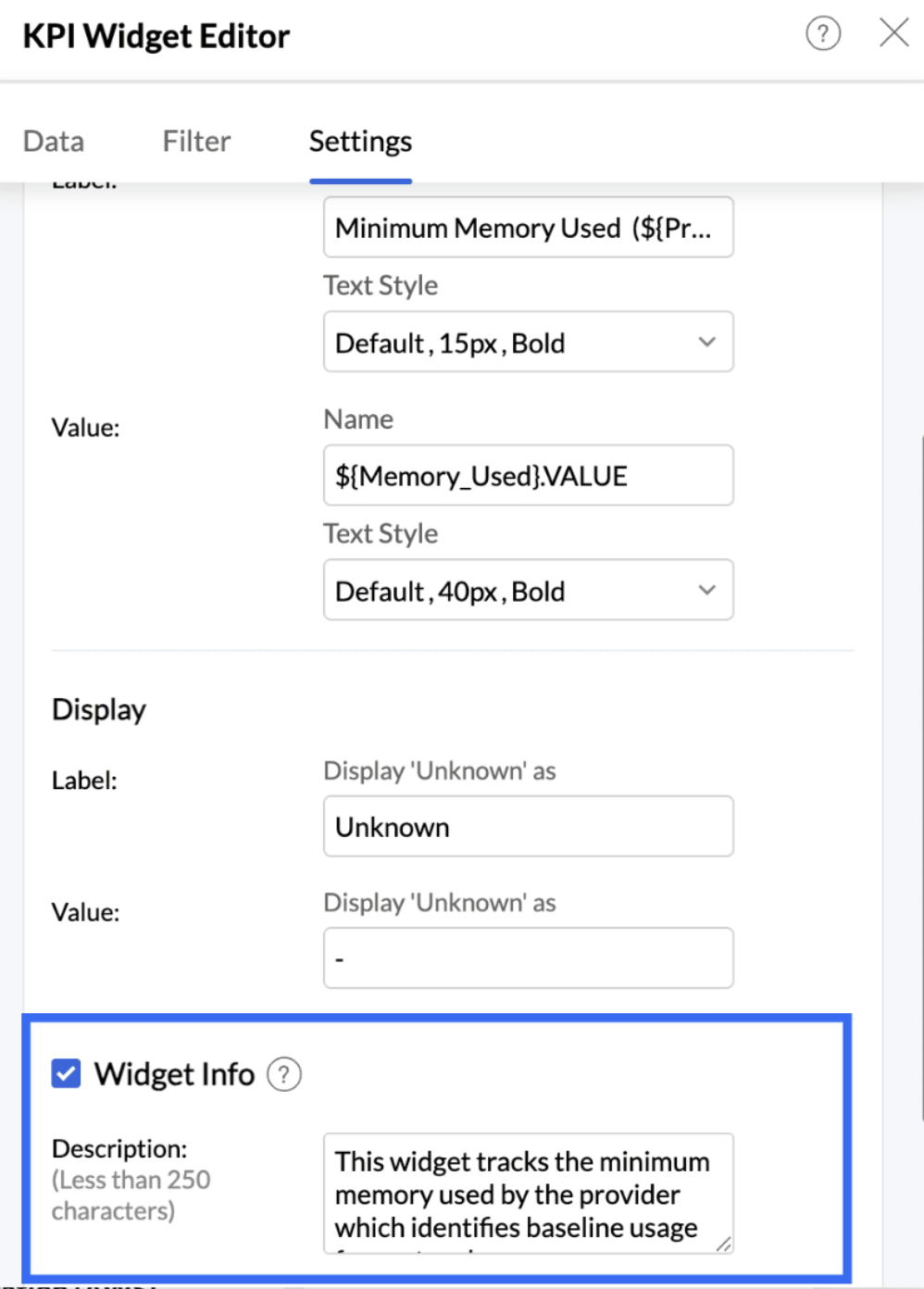 Analytics Plus allows you to equip widgets with an informational tooltip. This is achieved by enabling an information icon and providing a concise description.