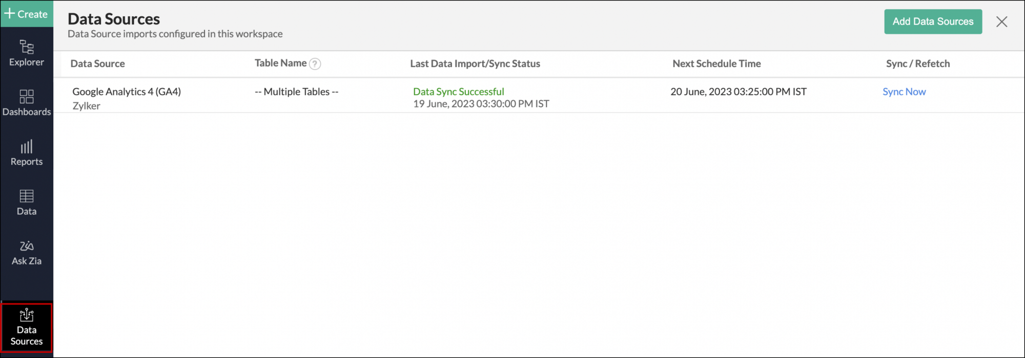 Click the Data Sources button from the side panel. This opens the Data Sources summary page which lists all the configured data sources in the workspace.
