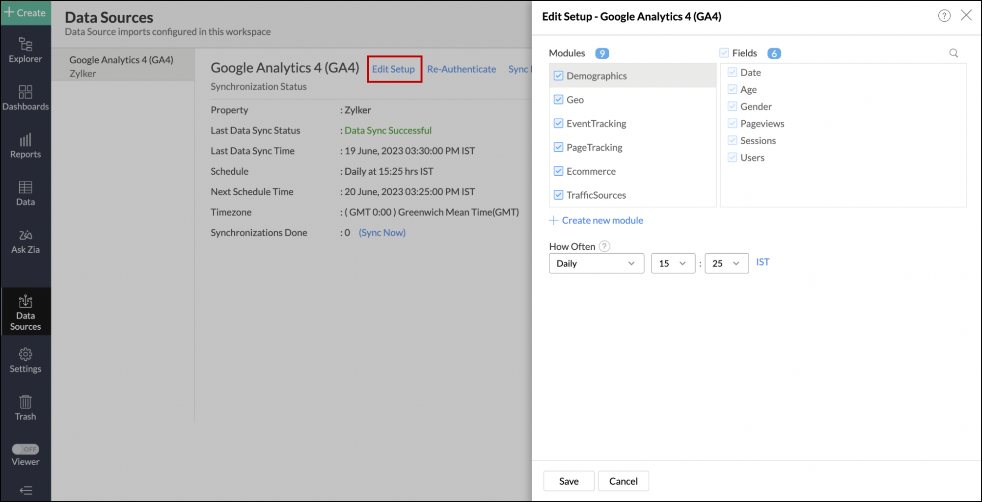 Navigate to the Google Analytics 4 (GA4) data source, and click the Edit Setup link.