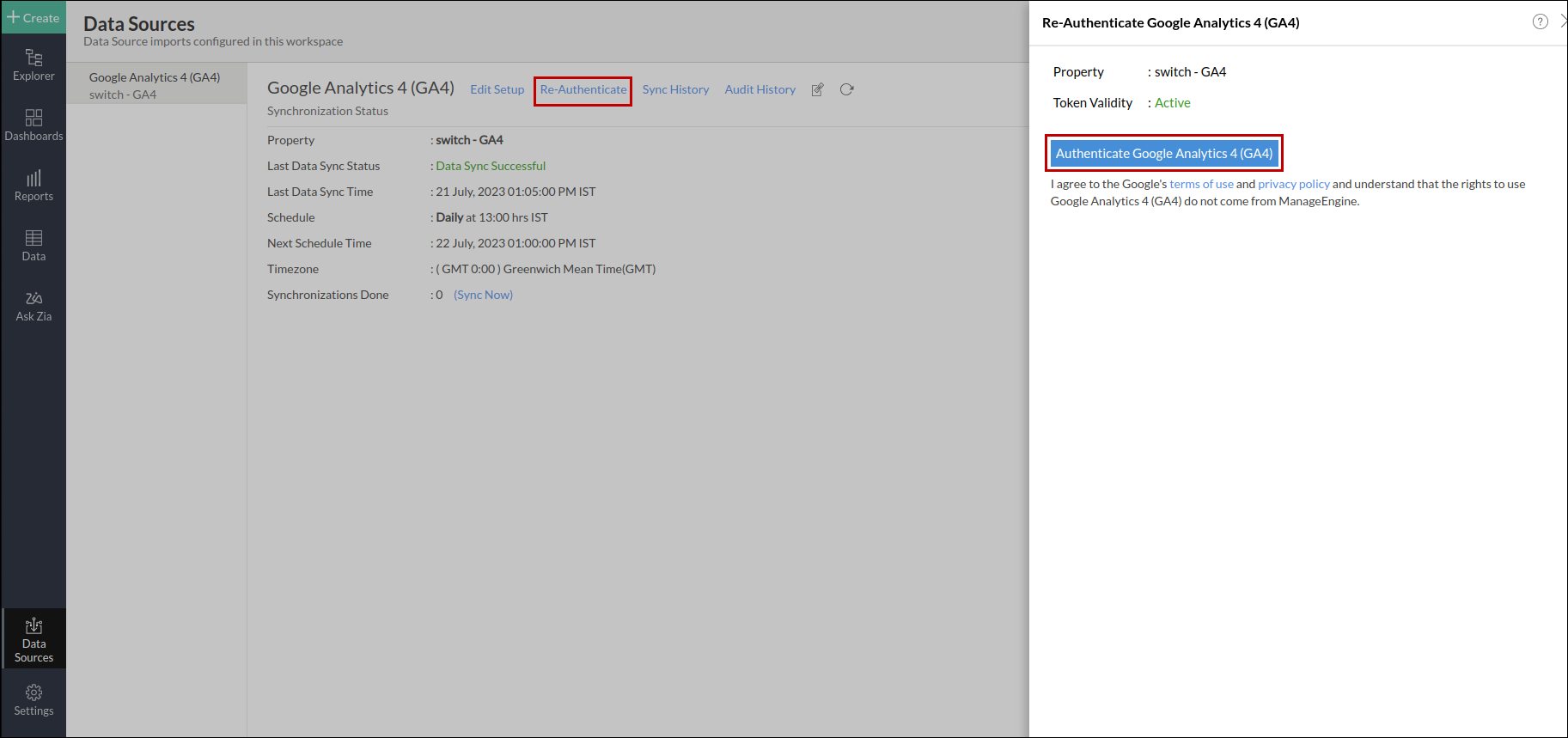 Navigate to the Google Analytics 4 (GA4) data source, and click the Re-Authenticate link.