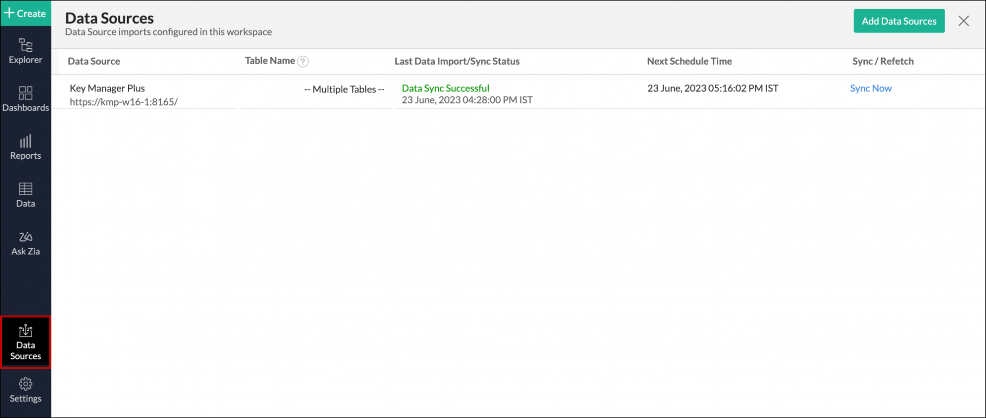Yes. To do this, click the Data Sources option from the side panel. In the page that appears, navigate to the Key Manager Plus source and click the corresponding Sync Now button.