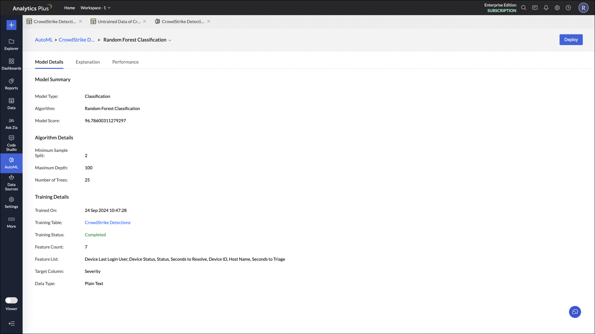 Once the training is completed, the model will be saved and will be listed in the Analysis tab. Click the model name to get additional details such as the Algorithm Name, Accuracy and Training Time of the model.