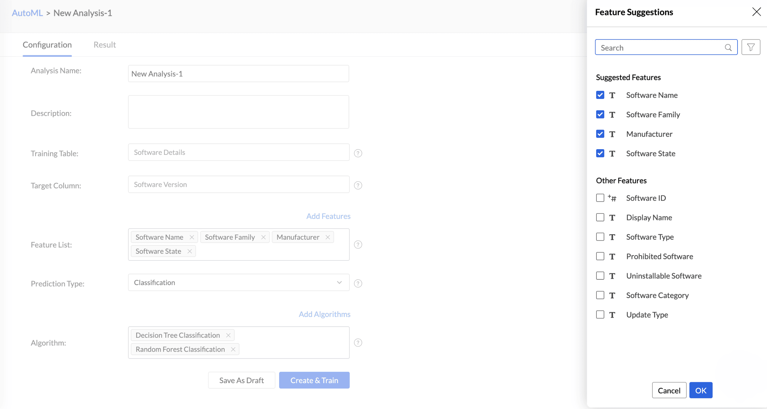 The Save as Draft option lets you preserve the model configuration, including algorithm selection and feature settings, so that you can initiate model training later at your convenience.