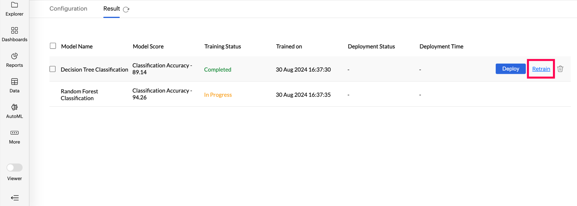 Retraining a specific ML model: Access the AutoML tab and choose the Model you want to retrain. Hover on the model and click Retrain.