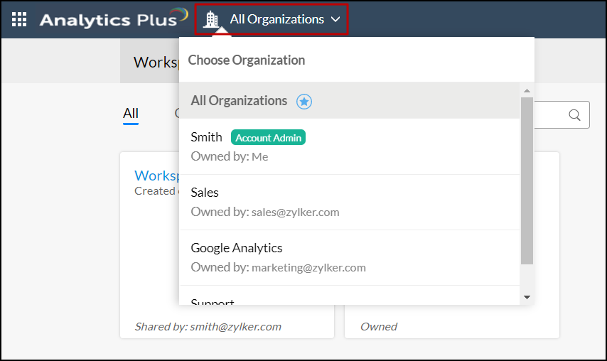 To access all the workspaces of the organization you own and are a part of, click the All Organizations option.