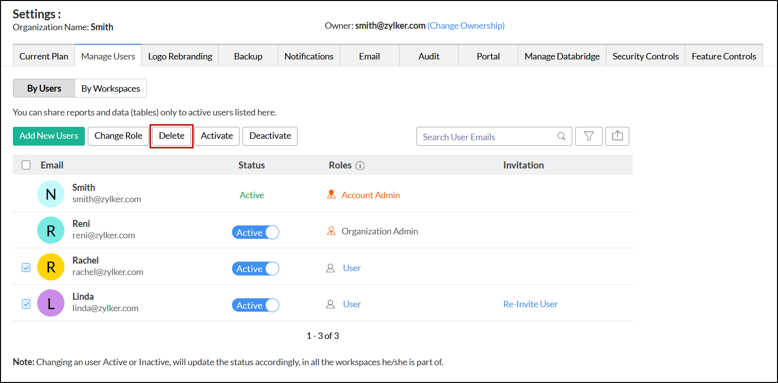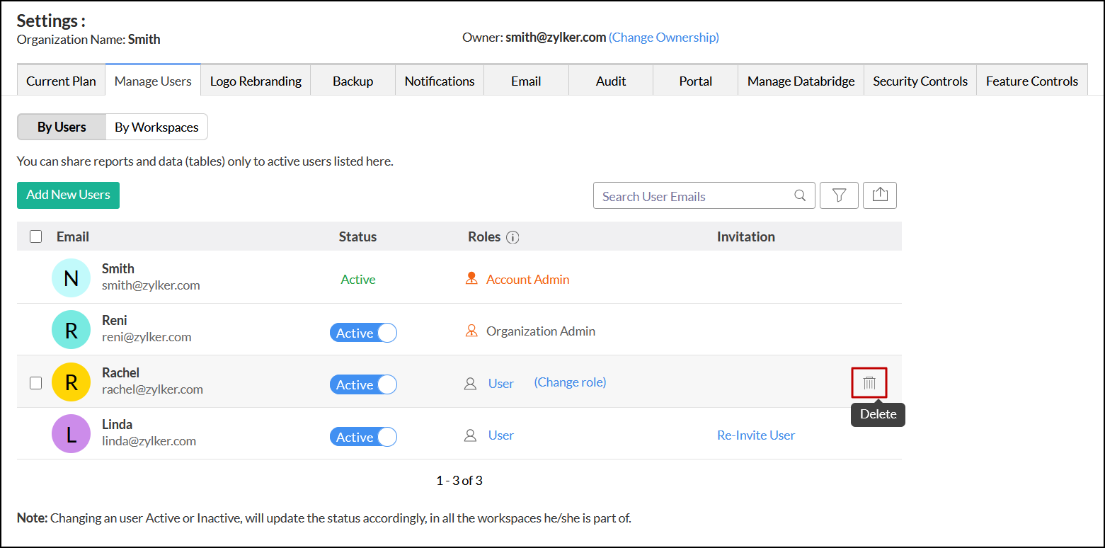 To remove a user from your organization, navigate to the Manage Users tab in the Settings page and click the Delete icon that appears on mouse over the required user name.