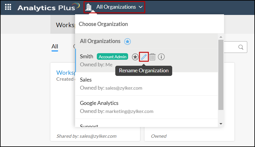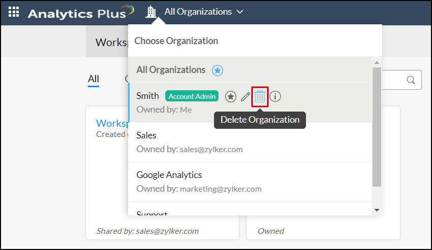 Analytics Plus allows you to delete an organization only if you own the organization and are part of at least one other organization. To delete an organization, click the Organization icon > Delete icon that appears on mouse over the organization name owned by you. Click Yes to confirm the action when prompted.