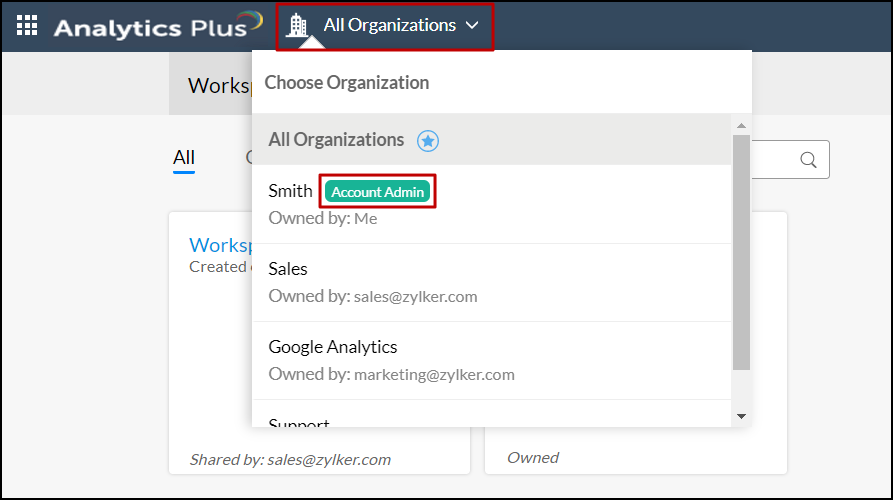 Organization refers to an Analytics Plus account subscribed to a paid plan. An organization can have multiple workspaces and users associated with it. Users have access to the Workspaces and functions, based on their various roles. Click here to learn more about roles in Analytics Plus.