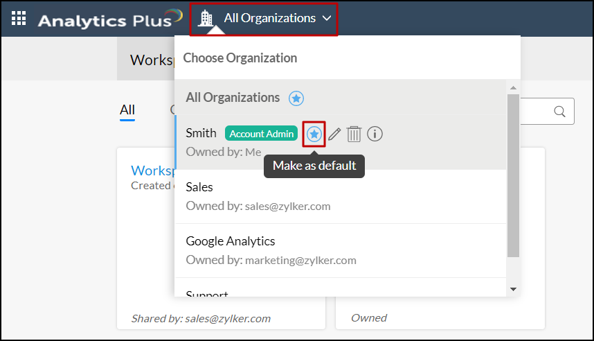 To set an organization as default, click the Organization icon > Make as default icon that appears on mouse over the required organization name.