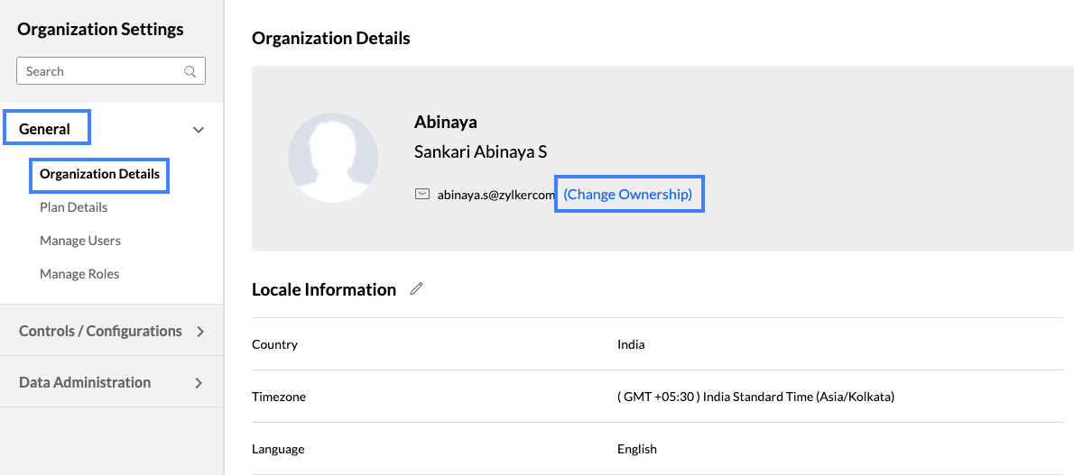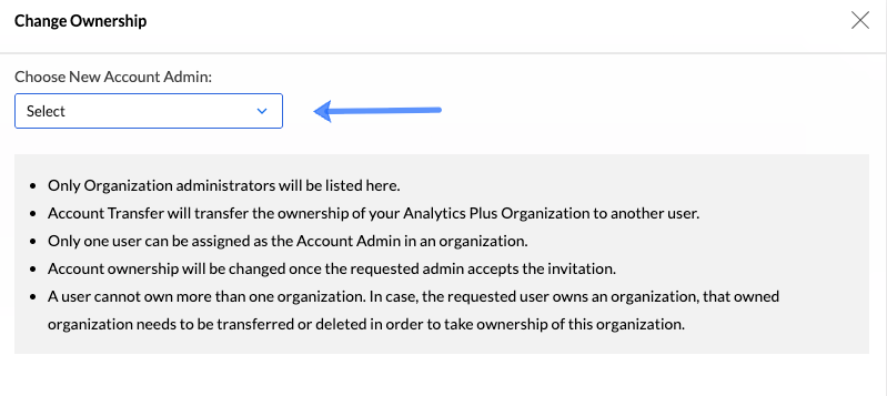 • From the Organization Details page, click Change Ownership. In the dialog box that appears, click on the ChooseNew Account Admin dropdown and select the user you want to assign as the admin. Please refer to the image below for more details.