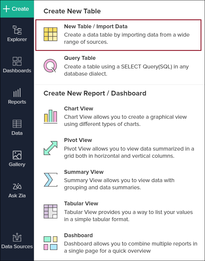 To do this, open the OpManager workspace, click Create from the side panel and select the New Table / Import Data option. You can integrate with other applications, or choose to import data stored in local files, web URLs, local databases, and cloud databases. Click the corresponding links to know more.