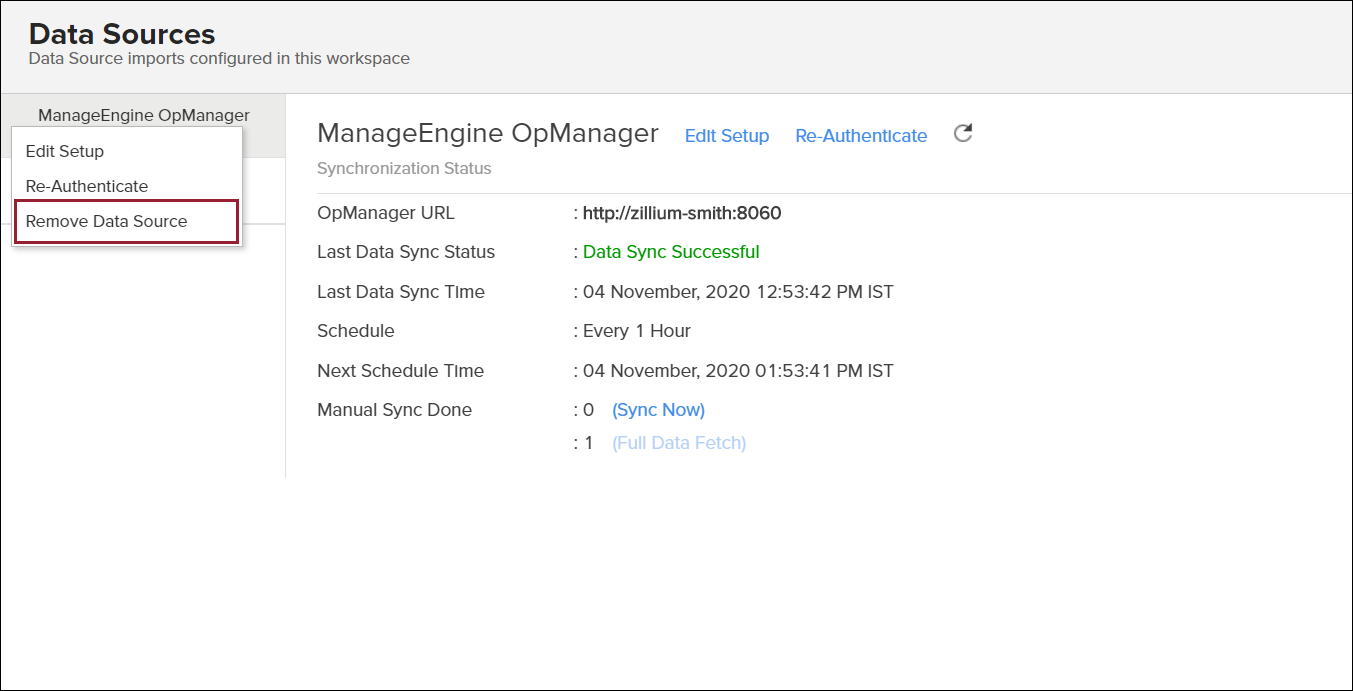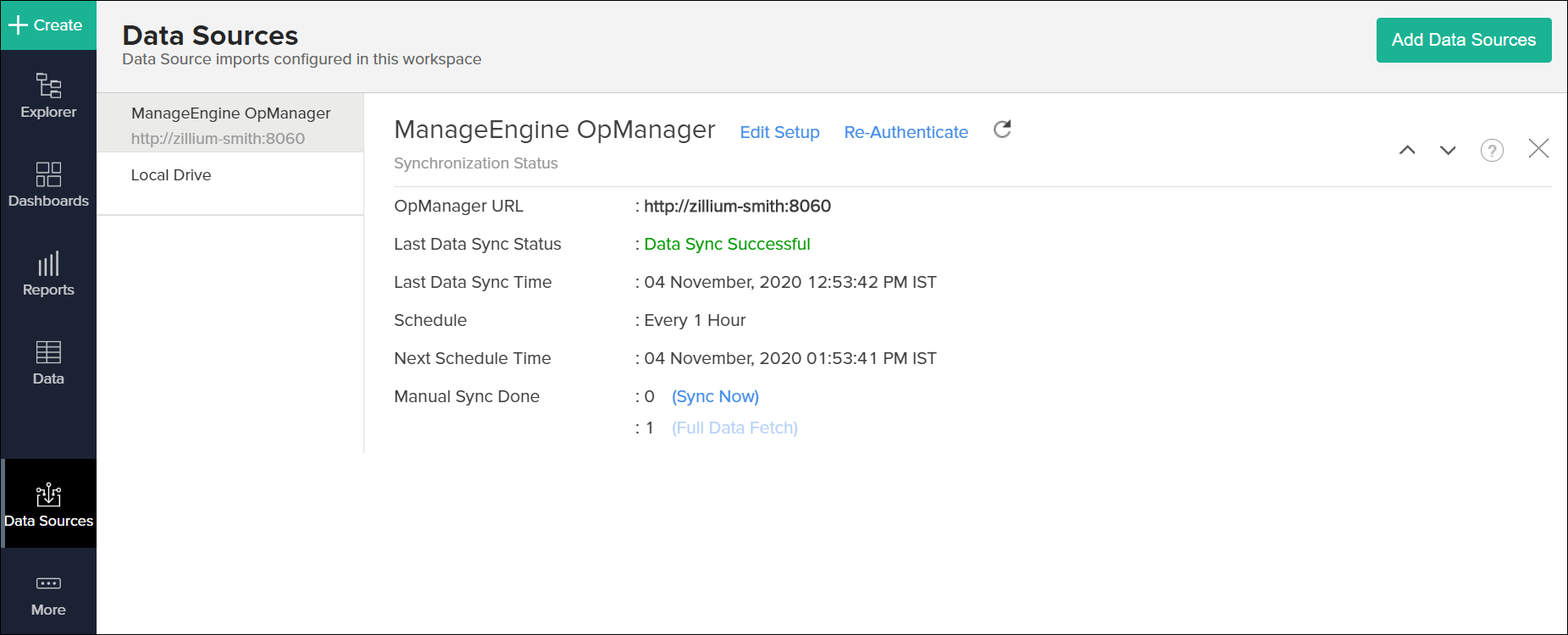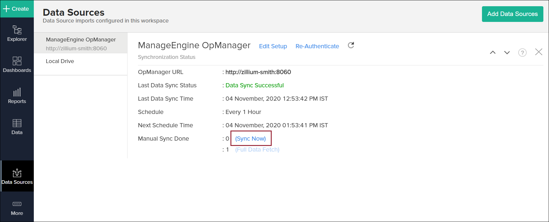 The synchronization of your OpManager data can sometimes fail, due to a variety of reasons. To resolve this, click the Data Sources option from the side panel and click the Re-Authenticate link.