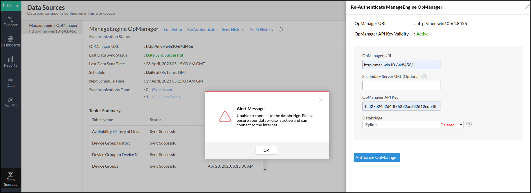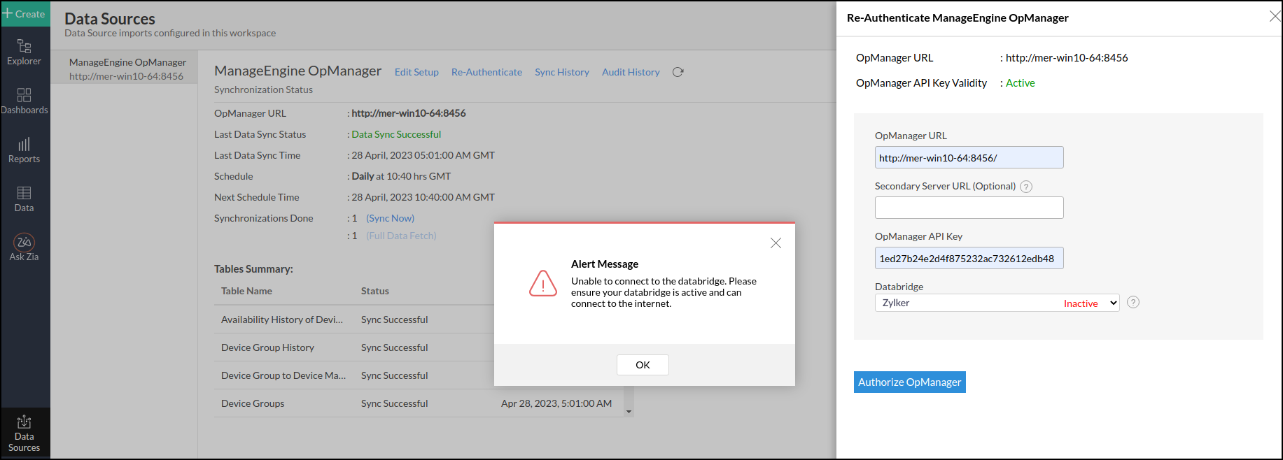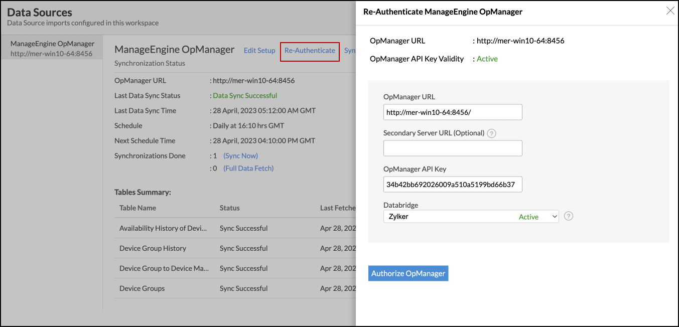 The synchronization of your OpManager data can sometimes fail, due to a variety of reasons. To resolve this, click the Data Sources option from the side panel and click the Re-Authenticate link.