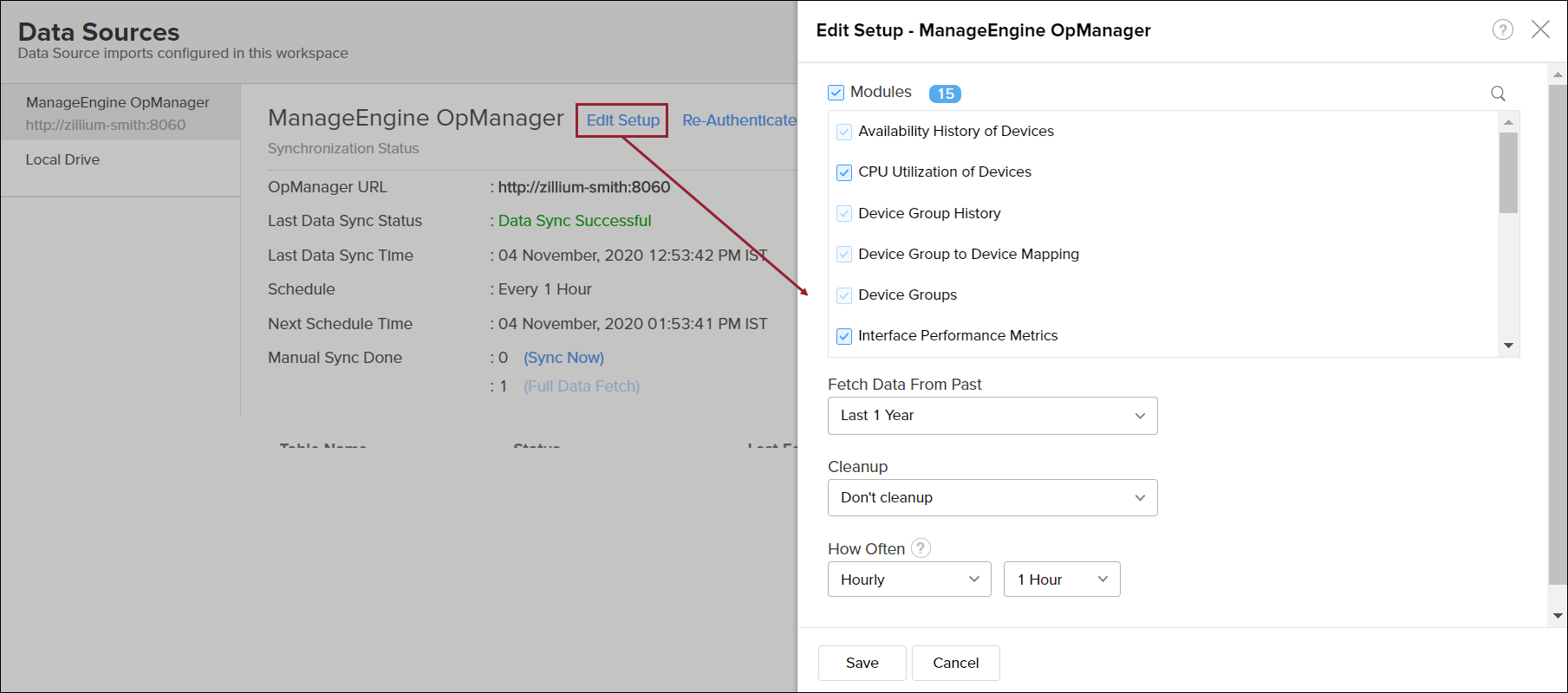 To edit the connection and synchronization settings, select Data Sources -> OpManager from the side panel.