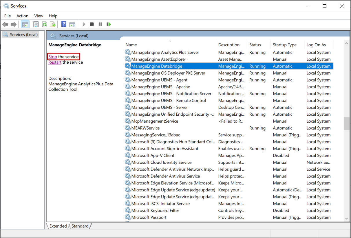 • Open Windows Services and head to the ManageEngine Databridge service.