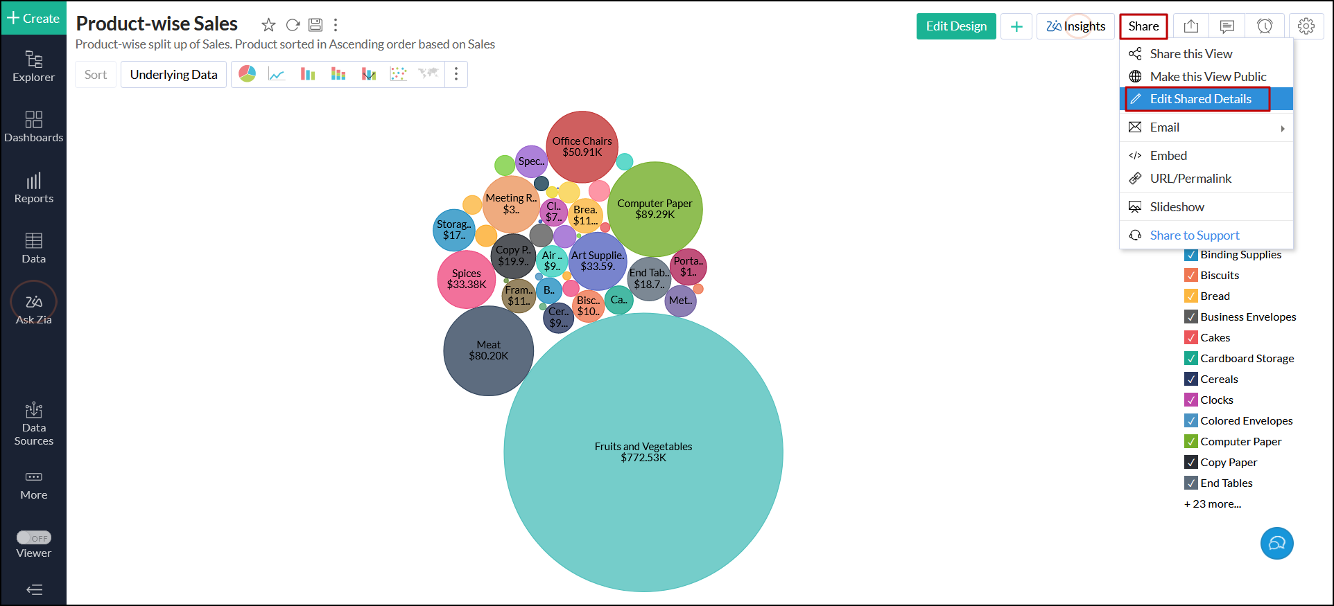 • Open the required view in Analytics Plus, click the Share button, and select Edit Shared Details.