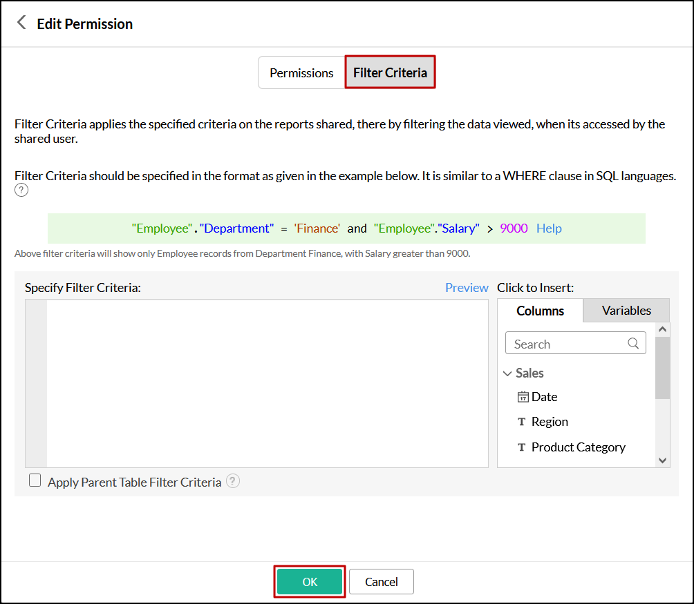 • Head to the Filter Criteria tab, add the required filters, and click OK.