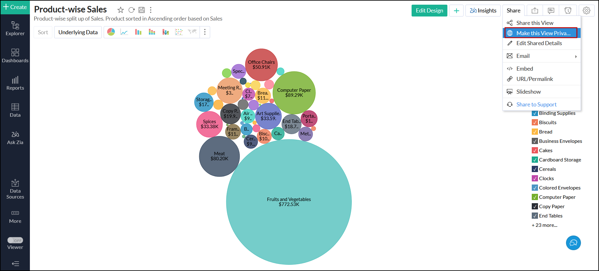 • Open the required report in View mode, click the Share button, and select the Make this view Public option.