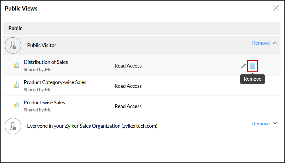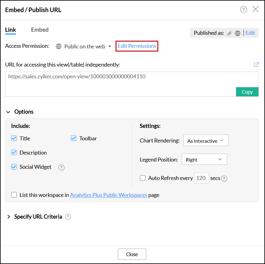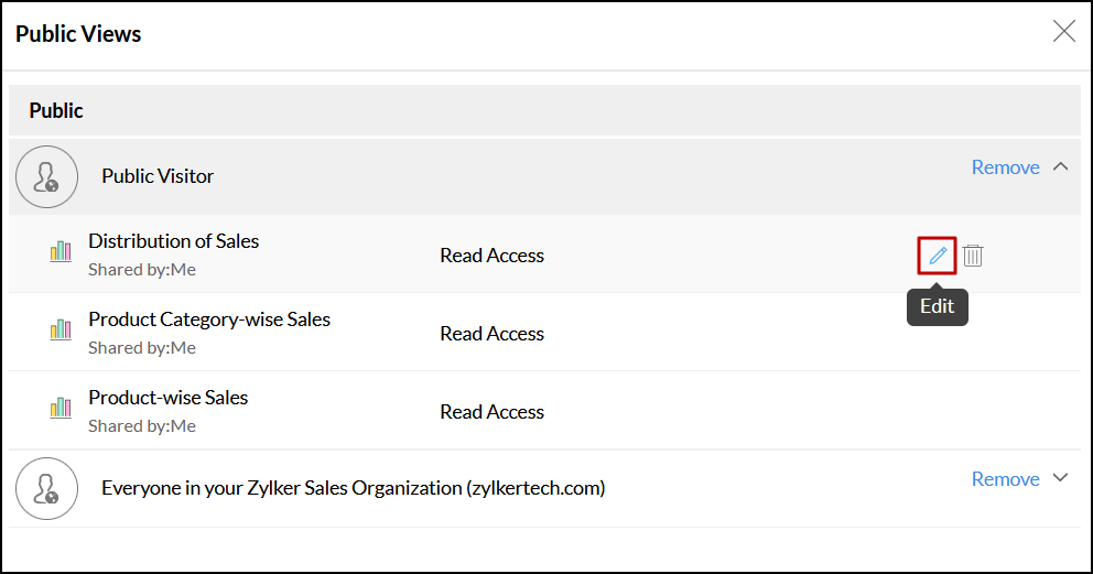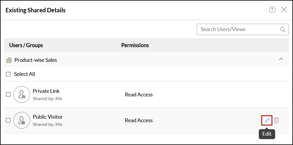 Analytics Plus allows you to edit the access permission for the views shared publicly. You can view and edit the access permission in two ways.