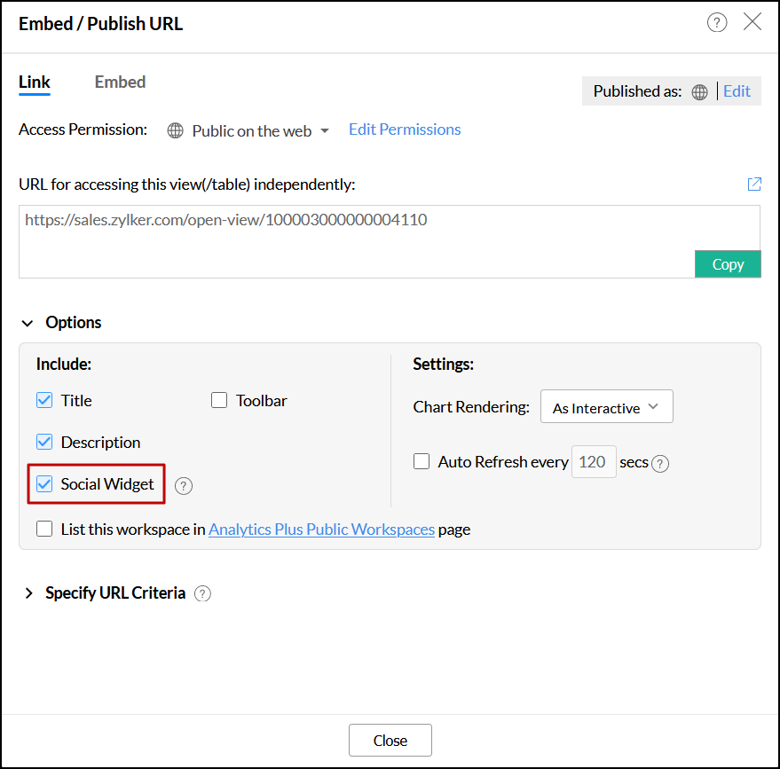 • Public on the web: This option allows you to make the view(s) publicly accessible to any user on the web. Users can access the shared views seamlessly without logging into any application.