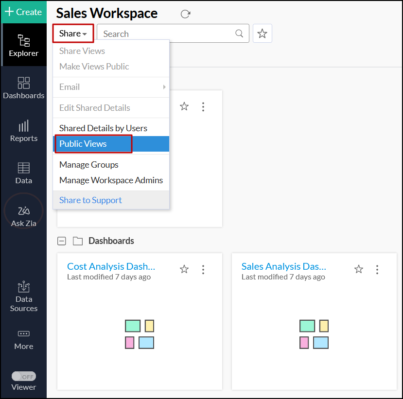• Open the required workspace in Analytics Plus, click the Share button, and select Public Views.