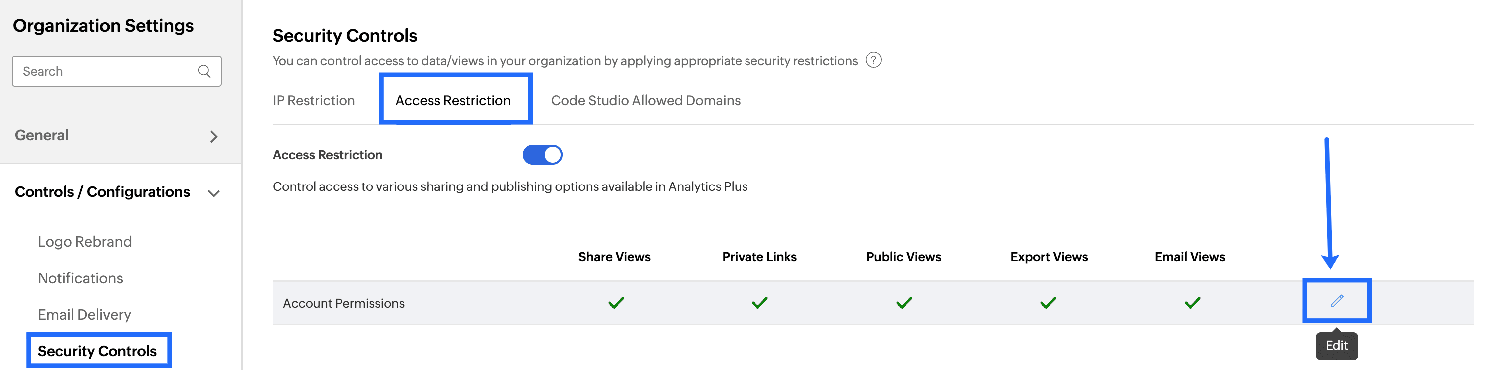 The Access Restriction allows you to control various sharing and publishing options available in your Analytics Plus account. To configure the Access Restriction option, navigate to Settings>>Security Controls>>Access Restriction>>Edit option.