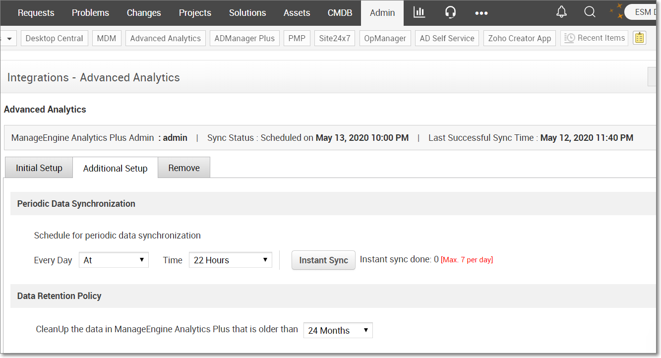 Yes. To do this, open your ServiceDesk Plus application. Navigate to Admin > Advanced Analytics, and click the Additional Setup tab. The Instant Sync button allows you to trigger a data synchronization manually. This action can be done a maximum of seven times in a day.
