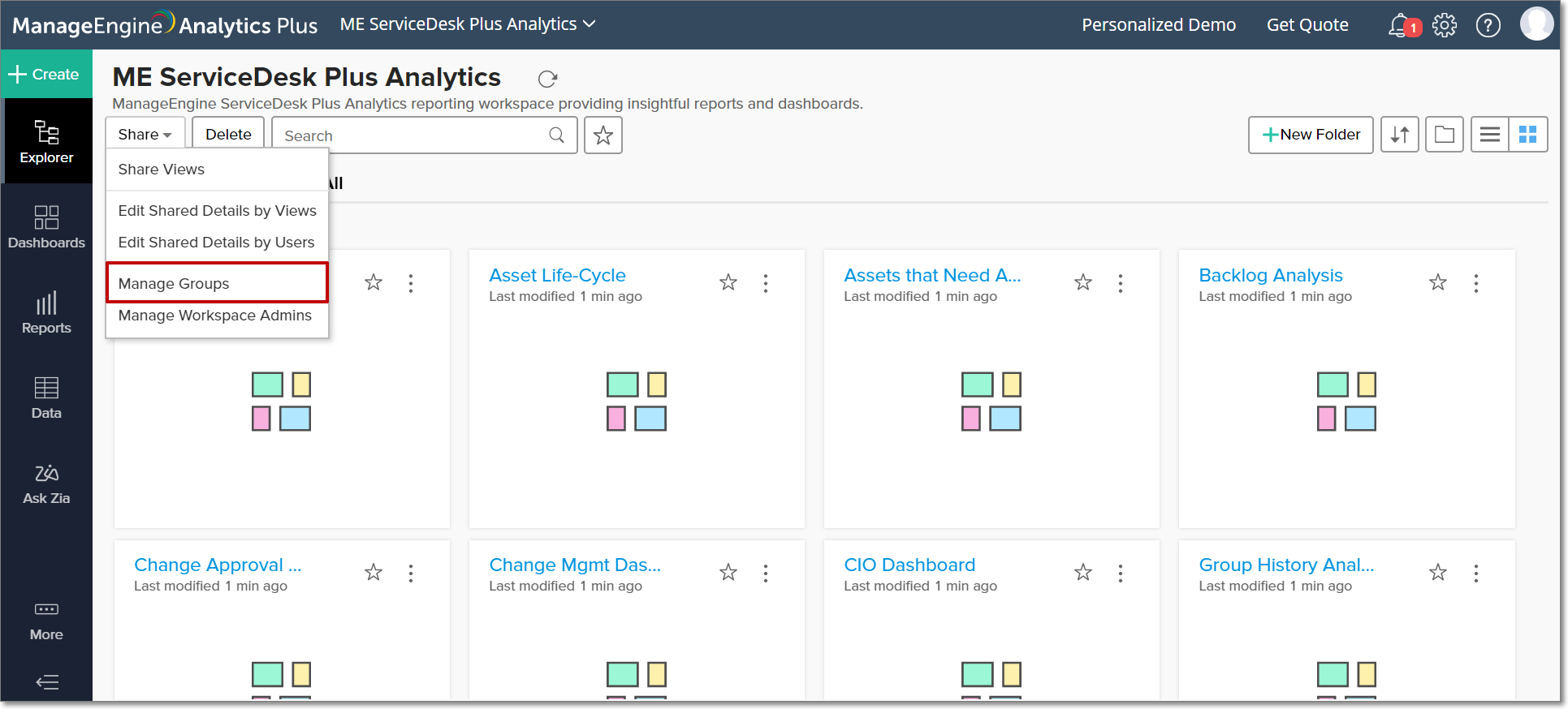 To facilitate easy collaborations, you can create Groups in Analytics Plus that contain a set of users. Reports and dashboards can then be shared to these groups, with the required permissions and filters applied. Any number of groups can be created within a workspace, and these groups are applicable only to the workspace they are created in.