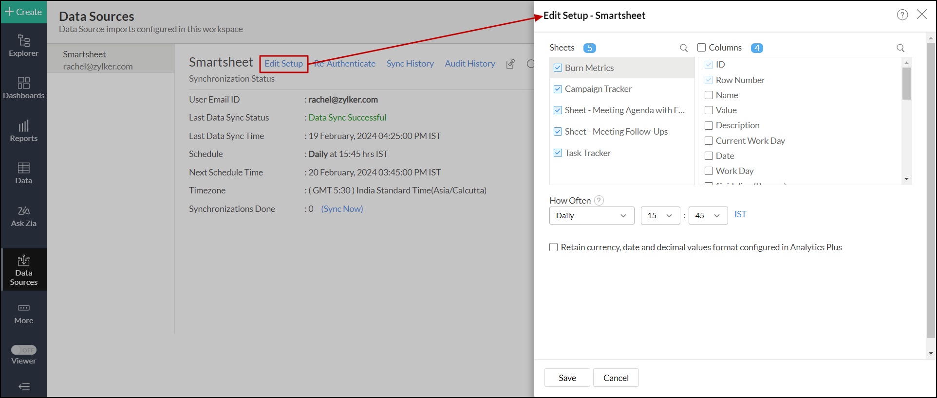 2. Navigate to the Smartsheet data source, and click the Edit Setup link.