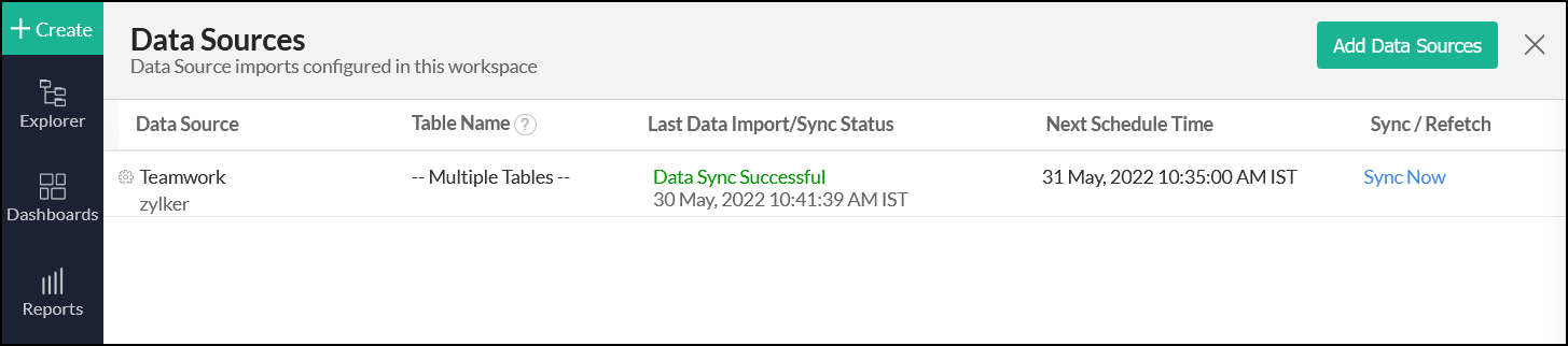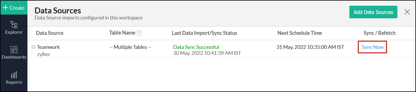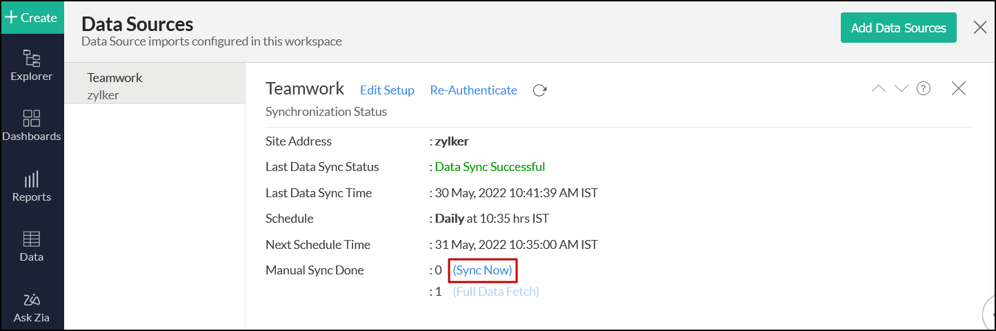Yes. To do this, click the Data Sources option from the side panel. In the page that appears, navigate to the Teamwork source and click the corresponding Sync Now button.