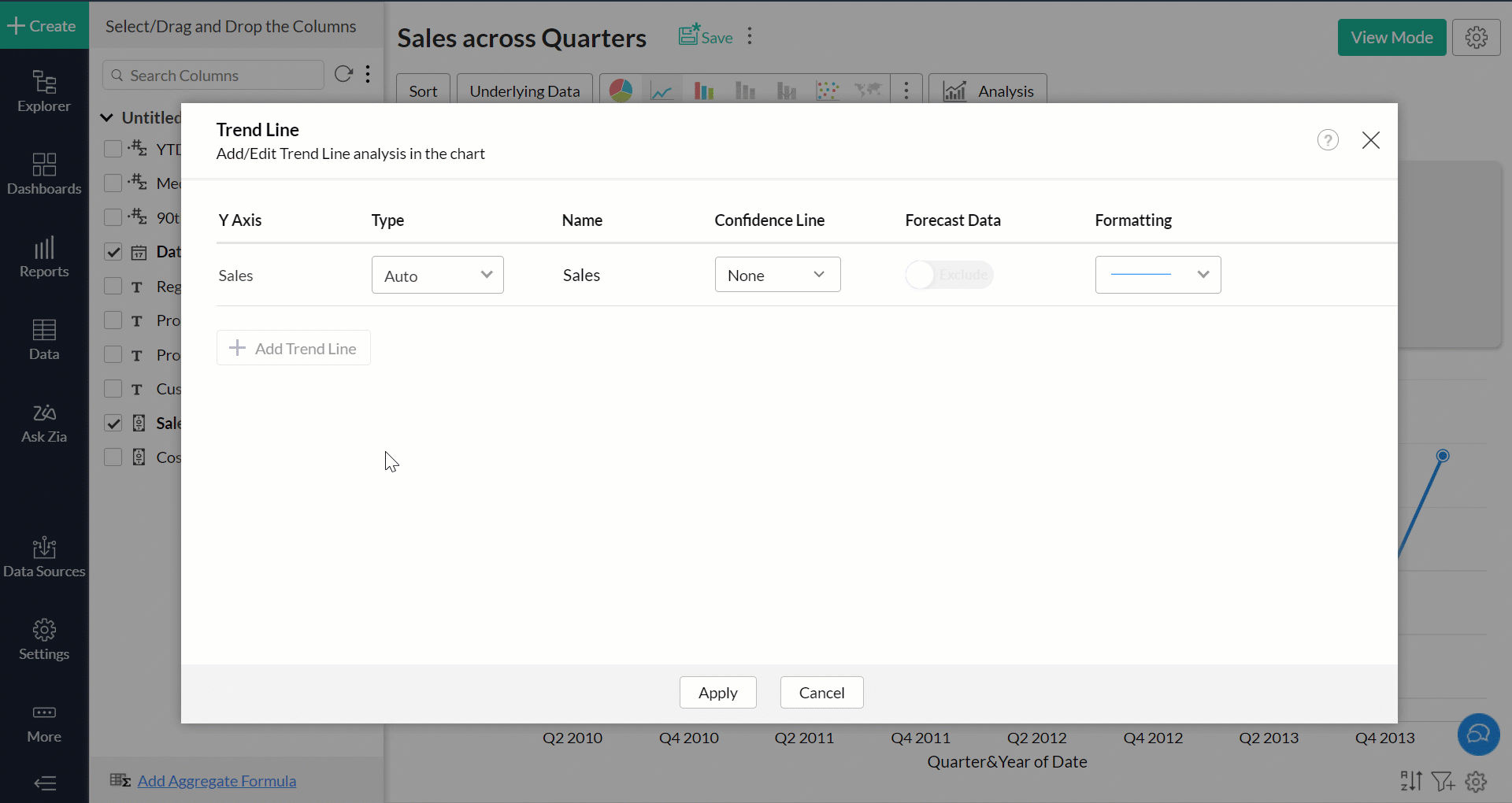Analytics Plus allows you to plot trend lines for a maximum of five aggregate columns in the Y-axis. To do this, click the Add Trend Line button in the trend line dialog, and select the required Y-axis value.