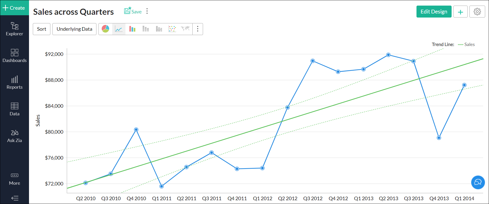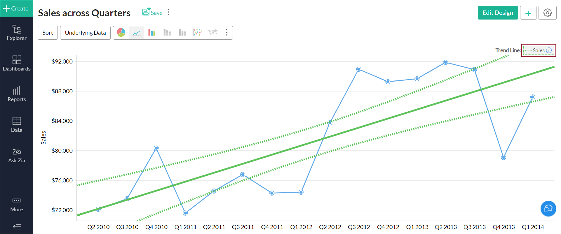 The following is the Sales across Quarters report with a trend line plotted over forecasted data.