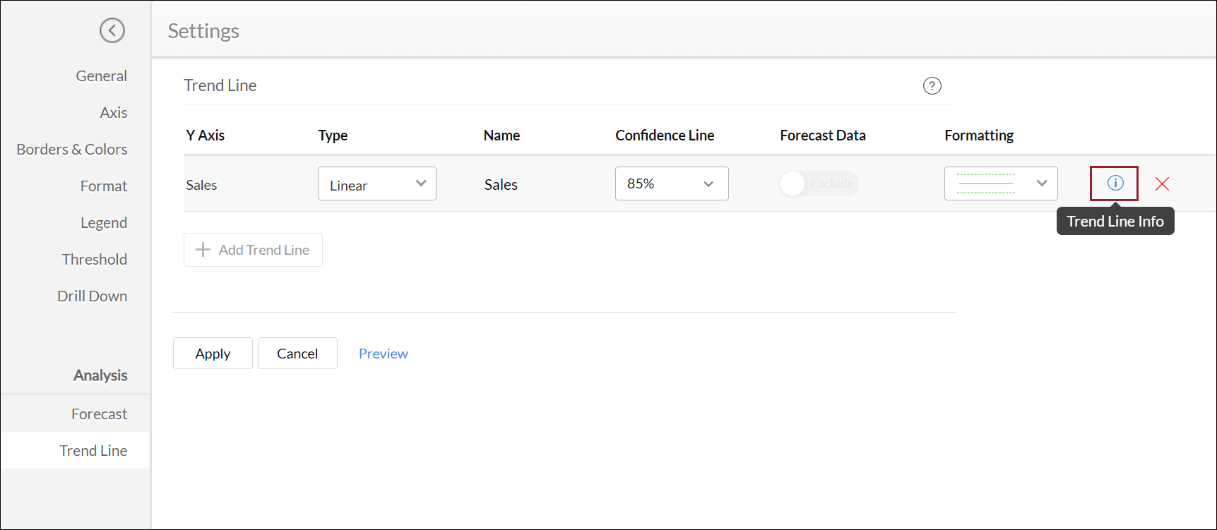 - You can also view the details from the chart's Settings page. Navigate to the Trend Line tab and click the Trend Line Info icon that appears on mouse over the listed trend line.